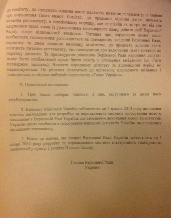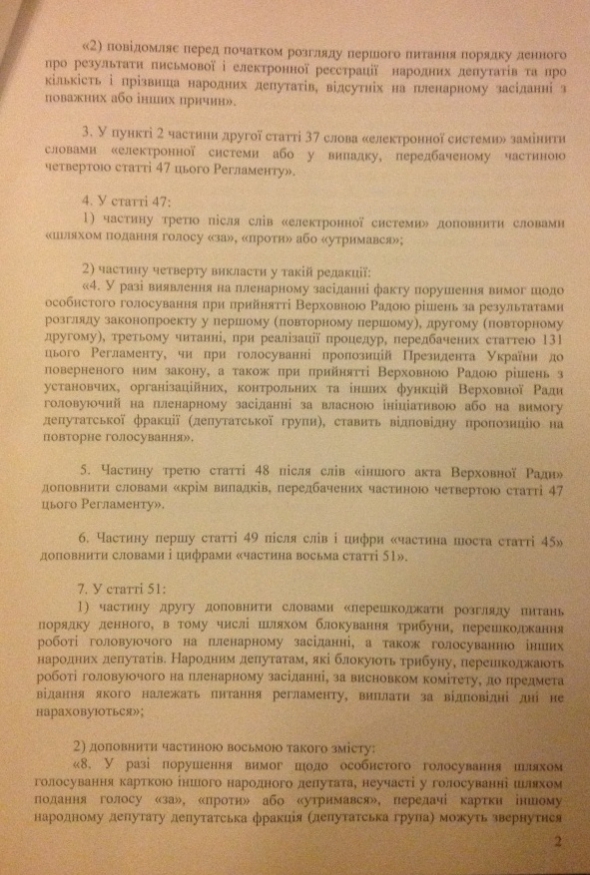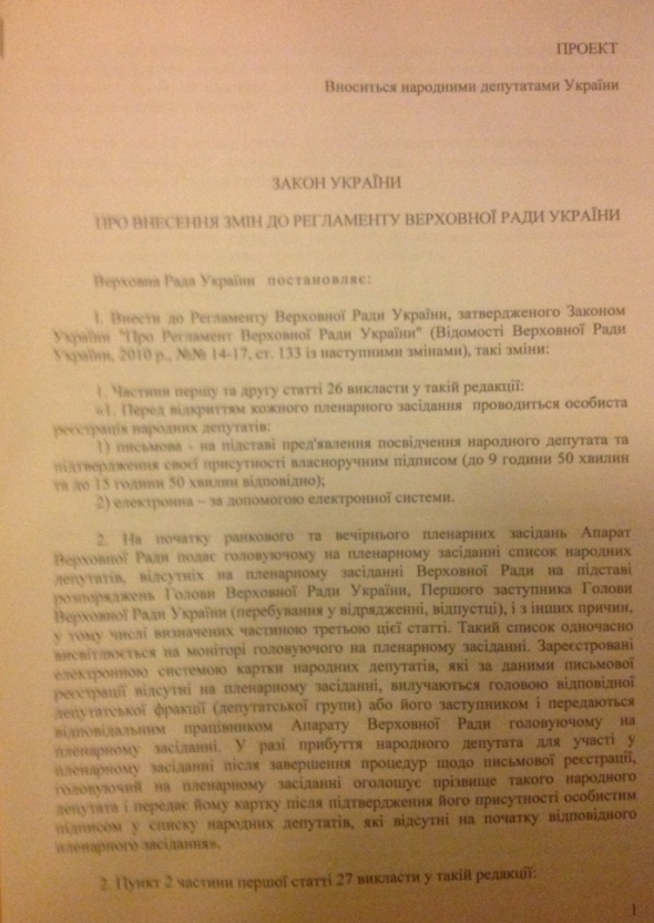По словам лидеров оппозиции, "регионалы" предложили, чтобы данный проект изменений в регламент с целью предотвращения "кнопкодавства" был подписан тремя руководителями оппозиционных фракций, тогда как остальные убеждены, что этот документ должен быть подписан всеми пятью главами фракций".