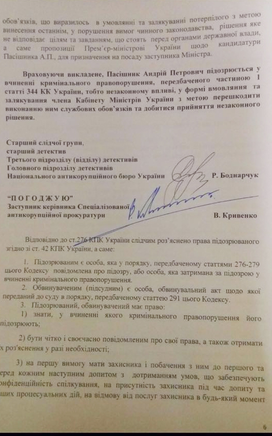 Пасишника подозревают в "незаконном воздействии на члена Кабмина с целью воспрепятствовать исполнению им служебных обязанностей или добиться принятия незаконных решений".