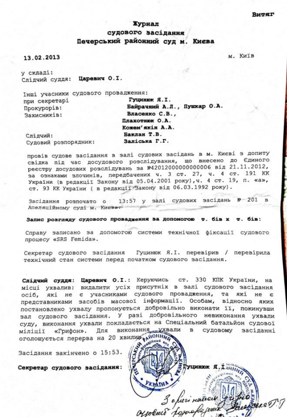 Напомним, накануне судья Царевич попросила покинуть зал заседаний всех, кто не имеет отношения к этому уголовного производства. Народные депутаты фракции "Батькивщина" отказались, их выдворили сотрудники спецподразделения "Беркут", после чего судья приступила к допросу Марьенкова.