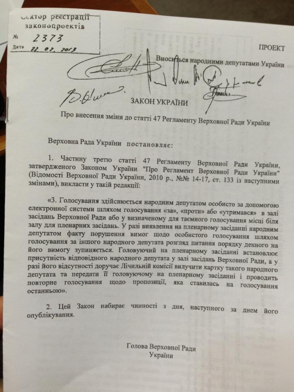 Тем временем нардеп от "Батькивщины" Андрей Пышный разместил на своей странице согласованный руководителями фракций проект изменений в регламент, который призван "разрушить практику кнопкодавства".