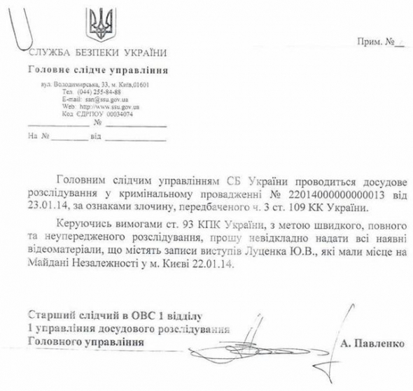 "СБУ обратилась к средствам массовой информации с требованием "немедленно предоставить всем имеющиеся записи публичных выступлений Юрій Луценко" на Площади Независимости 22 января 2014 года", - написал журналист.