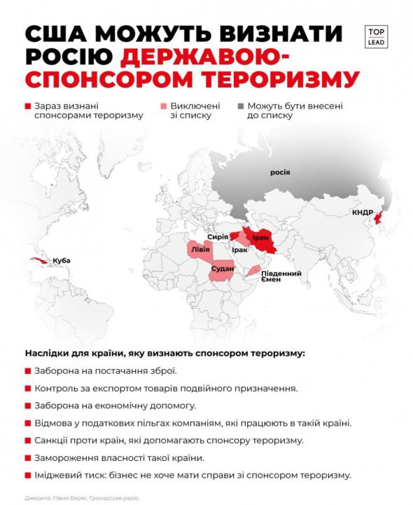 В Государственном департаменте США еще в апреле сообщили, что изучают все возможные способы давления на Кремль с целью заставить прекратить войну в Украине, в частности признание РФ государством, спонсирующим терроризм.