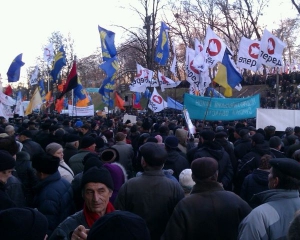 Количество участников акции протеста продолжает увеличиваться. Митинг по периметру окружен огромным количеством работников спецподразделения "Беркут" в полном боевом обмундировании, включая газовые баллончики и маски на лицах.