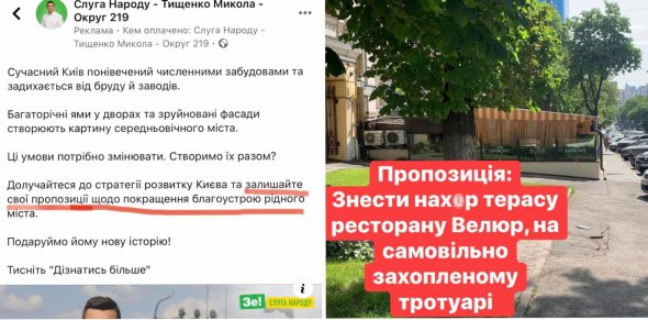 Народному депутату от "Слуга народа" Николаю Тищенко, который хочет баллотироваться в мэры Киева, напомнили о самовольно захваченном тротуаре возле его ресторана "Велюр".