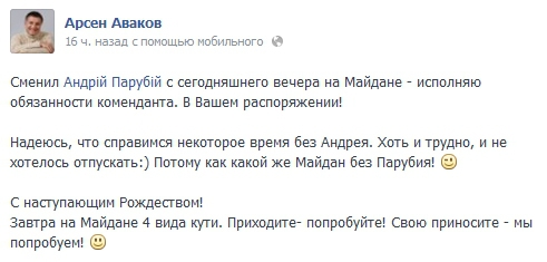 "Сменил Андрея Парубия с сегодняшнего вечера на Майдане – исполняю обязанности коменданта. В Вашем распоряжении!", – написал Аваков.