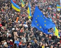 Митингующие держат небольшие голубые табличкі: "Здесь нет страха. Иди на Майдан", "У востока и запада одна цель - убрать бандитов из власти".