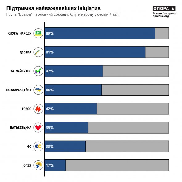 В около половины решений отдают свои голоса "за" также группа "Партия "За будущее", внефракционные, "Батькивщина" и "Голос". Наивысшей из всех сфер является также поддержка "Европейской солидарности" - 42%, а также ОПЗЖ - 23%.