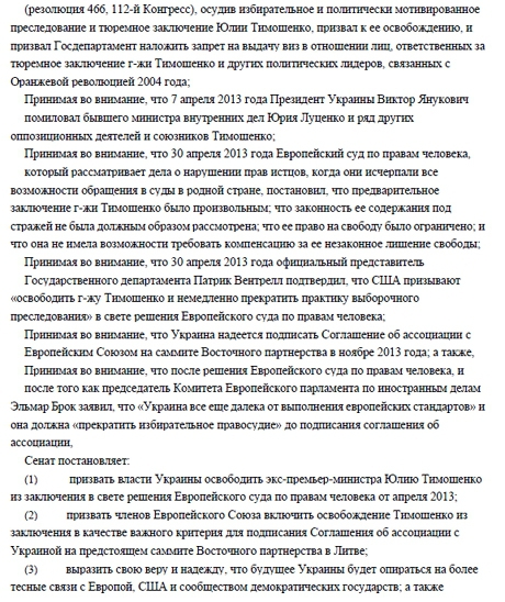 "Призвать власти Украины освободить экс-премьер-министра Юлию Тимошенко из заключения в свете решения Европейского суда по правам человека, принятого 30 апреля 2013 г. (...) Призвать членов Европейского Союза включить освобождение Юлии Тимошенко из заключения в качестве важного критерия для подписания Соглашения об ассоциации с Украиной на предстоящем саммите Восточного партнерства в Литве...", - говорится в проекте резолюции.