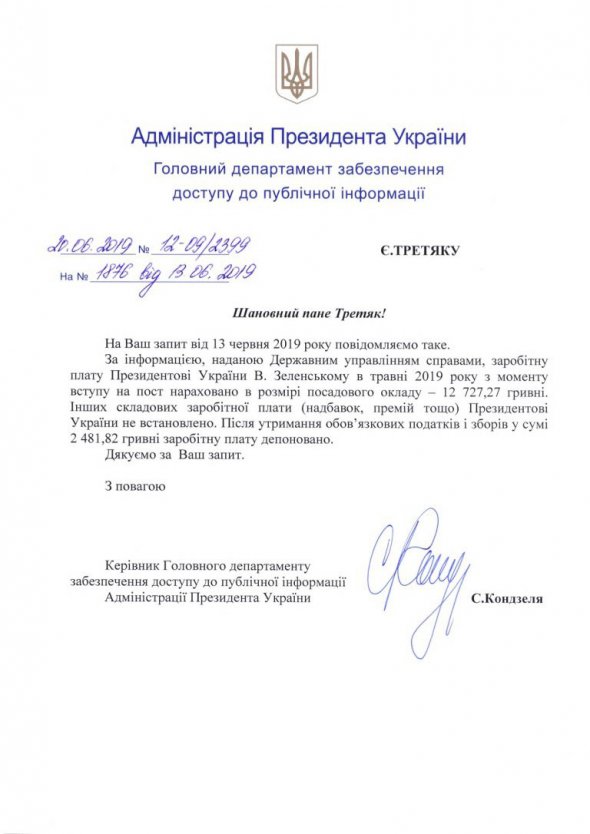 На руки Зеленский получил около 10 000 грн. Гаранту не начисляли премий и надбавок. Зарплата Зеленского была передана на хранение. Деньги президент еще не забирал.