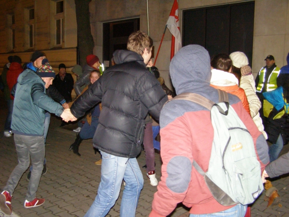 - После часа акции люди начинают подмерзать. Кто-то крикнул лозунг: "Кто не скачет, кто не скачет - тот мос-каль!". Вдруг эту фразу подхватывают все митингующие и начинают подпрыгивать в ритм с речитативом. После того, как все согрелись, организаторы просят не выкрикивать лозунгов, которые могли бы оскорбить людей других национальностей.