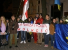 Митингующие - в основном молодежь - стоят кругом. Посередине - выступающие говорят в мегафон. Очень часто они обращаются с лозунгом "Слава Украине!". Молодежь упорно отвечает "Героям - Слава!" кроме того звучат: "Живе Беларусь!", "Украина - это Европа!", "Вместе - и до конца!", "Украина - превыше всего!" В доме Посольства светятся окна, некоторые из них - отклонены. Работники Посольства, наверное, слышат все, что происходит снаружи.