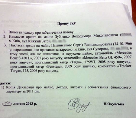 Как сказано в иске Окунской, Пашинский владеет двумя автомобилями "Mercedes" и тремя катерами.