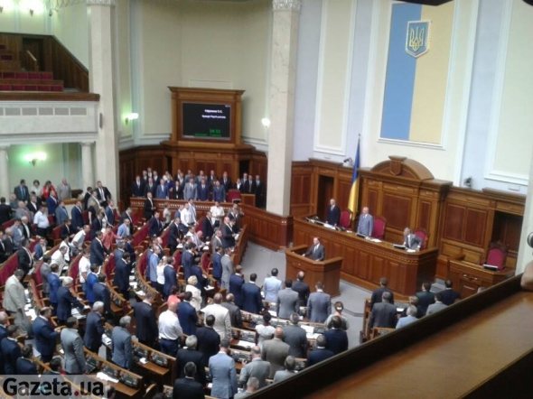 Все выступление он говорил по-русски. Зато депутаты от "Свободы" пытались заглушить его выступление скандированием "украинский!". Все народные депутаты стоя почтили память минутой молчания погибших во Второй мировой войне.