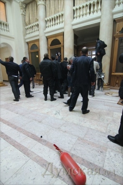 Они не выпускают депутатов из сессионного зала. На Думскую площадь стягиваются правоохранители. Пожарные поливают "свободовцев" водой через разбитое окно. В помещении до сих пор чувствуется сильнейший запах газа.