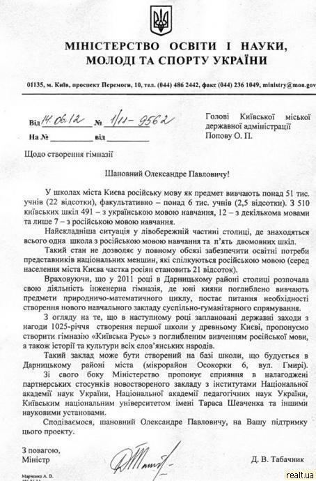 "Учитывая то, что в следующем году запланированы государственные мероприятия по случаю 1025-летия создания первой школы в древнем Киеве, предлагаем создать гимназию "Киевская Русь" с углубленным изучением русского языка, а также истории и культуры славянских народов", - говорится в письме.