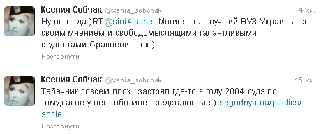 По мнению министра, в Могилянке лишь скандалят, как и Собчак, которая ничего больше не умеет: ни петь, ни танцевать, ни играть на сцене. Ксения, однако, осталась довольной сравнением, назвав Могилянку лучшим вузом Украины со своим мнением и свободомыслящими талантливыми студентами.