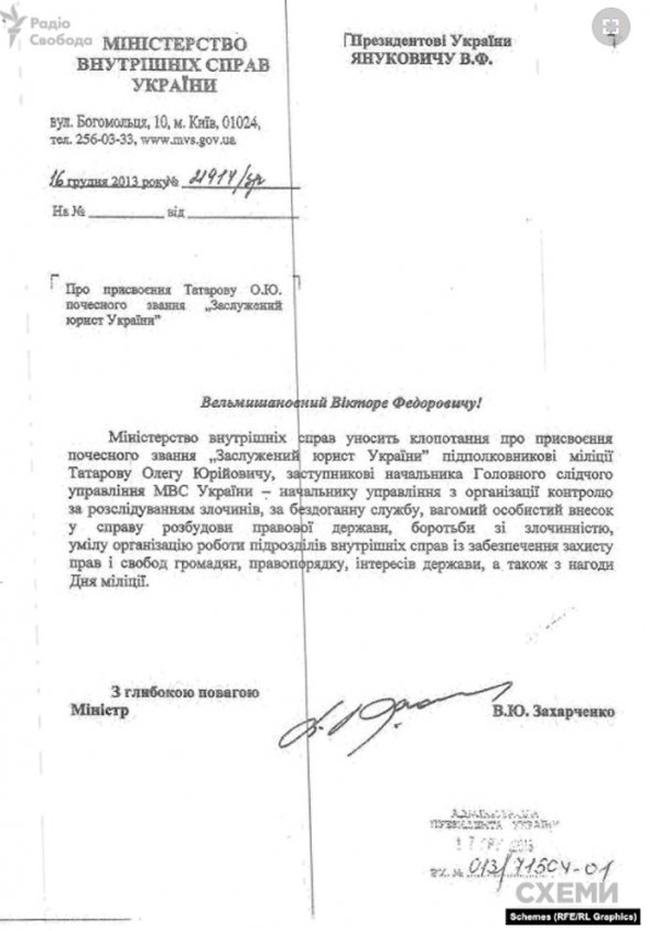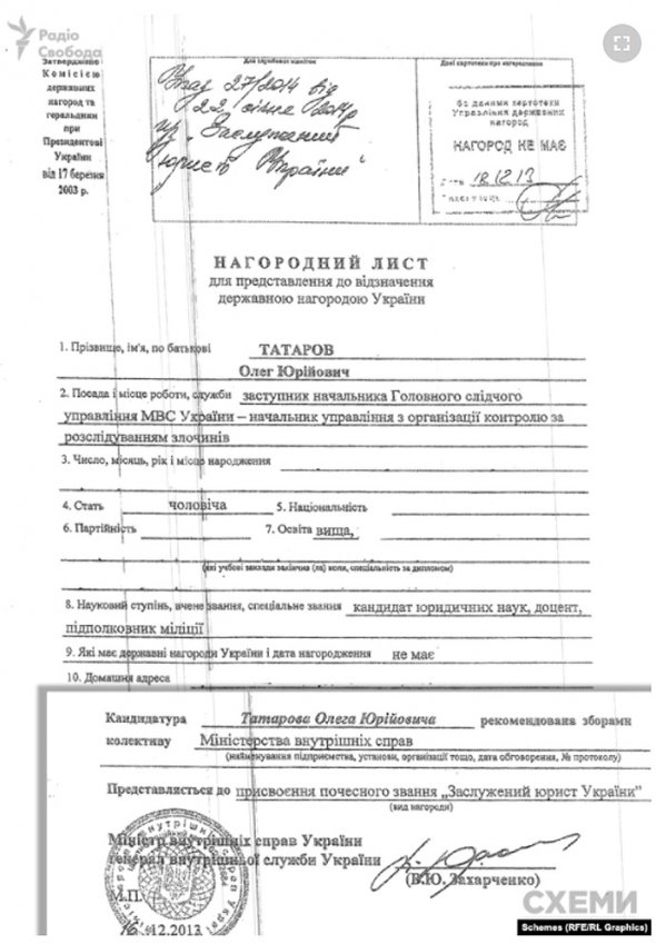 Представление о награждении Татарова на имя тогдашнего президента Виктора Януковича Захарченко внес 16 декабря 2013 года.