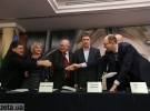 - Думаю, спрашивать кто против или воздержался не целесообразно, - замечает, берет белую папку с золотистым трезубцем вверху и подписывает документ в ней. Передает ее по ряду. Лидеры Объединенной оппозиции ставят свои подписи. Возвращают документ Яценюку.