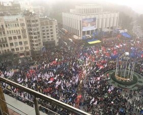Майдан на Европейской площади заполнен. Люди стоят не только на площади, но и заняли склоны парка " Крещатого", стоят на парапетах. И на дорогах в сторону улиц Грушевского, Крещатик. Очень много партийных флагов "Свободы", " Удара" и "Батькивщины ". Также присутствуют флаги ЕС, Украины и красно-черные флаги УПА.