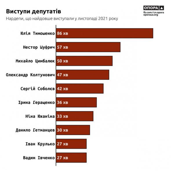 Тимошенко выступала 29 раз, говорила 1 ч 26 мин. Нестор Шуфрич из ОПЗЖ выступал 50 раз, 55 мин. Далее - Михаил Цымбалюк из "Батьківщини" - 27 выступлений, 50 мин.