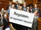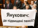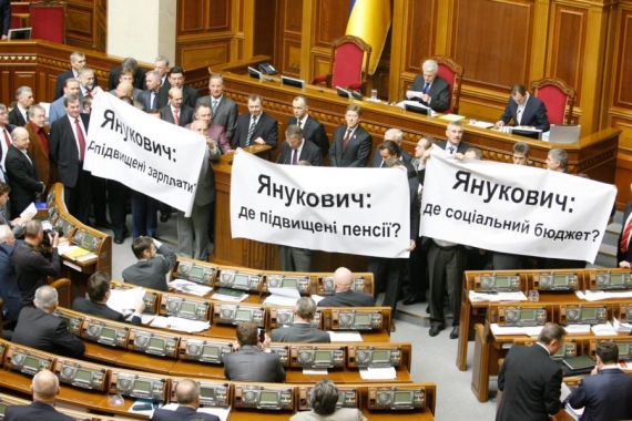 Перед этим бютовцы устроили в сессионном зале мини-блокирование. Во время выступления лидера фракции БЮТ Ивана Кириленко они вышли к трибуне и развернули три плакаты: "Янукович, где повышенные пенсии?", "Янукович, где социальный бюджет?", "Янукович, где повышенные зарплаты?".