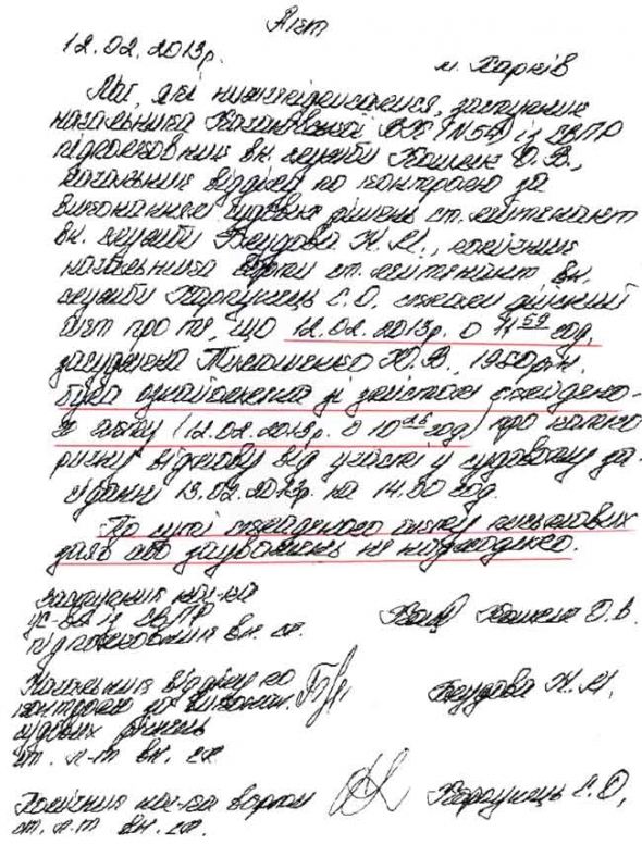 Впоследствии защитник Тимошенко Власенко заявил, что экс-премьер ни в письменной, ни в устной форме не отказывалась от участия в этих следственных действиях. Затем ГПтС опубликовала на своем официальном сайте акт, в котором указано, что Тимошенко в категорической форме отказалась от участия в этом судебном заседании.
