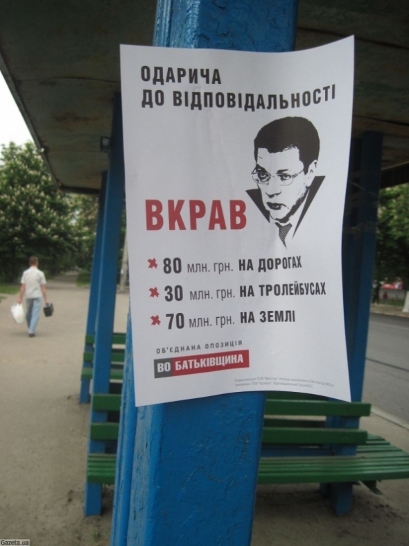 На листах, формата А4, написано: "Одарича к ответственности. Украл 80 миллионов на дорогах, 30 на троллейбусах, 70 - на земле". Подпись от имени ВО "Батькивщина".