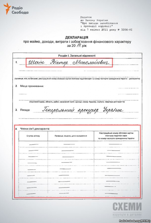 Все это в декларациях о доходах и имуществе прокурора Шокина не указано. А в разделе "имущество семьи" экс-генпрокурор поставил прочерки.