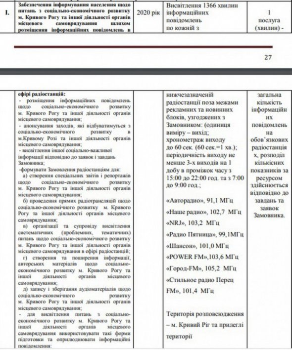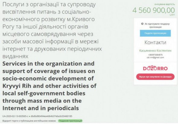 Кроме того, в то же время был объявлен тендер на закупку услуги по организации и сопровождению освещения вопросов социально-экономического развития Кривого Рога и иной деятельности органов местного самоуправления через средства массовой информации в сети интернет и печатных периодических изданиях.