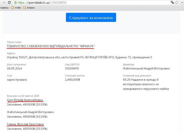 Виталий Енин основал также ООО "Фирма РК", но не сам – компаньонами Енина стали Андрей Жаботинский и Ярослав Гивель – правая рука семьи Вилкулов и руководитель основанного Александром Вилкулом благотворительного фонда "Будущее Кривбасса".