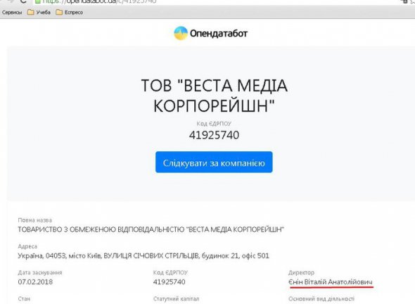 ООО "Веста медиа Корпорейшн" – киевская фирма. Впрочем, лишь формально: ее директором и единственным учредителем является некий Виталий Енин – житель села Надеждовка Криворожского района.