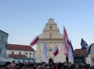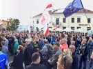 Собравшиеся развернули бело-красно-белые флаги, скандируют "Жыве Беларусь", "Лукашенко - за решетку".
