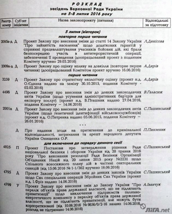Проект постановления о согласии Верховной Рады на привлечение к уголовной ответственности, задержание и арест депутата от "Воли народа" Александра Онищенко рассмотрят во вторник, 5 июля.