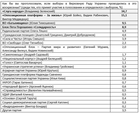 По результатам опроса, проведенного 13-17 мая 2019 года, если бы парламентские выборы состоялись в ближайшее воскресенье, шансы на попадание в следующий состав украинского парламента получили бы следующие партии: "Слуга народа" новоизбранного президента Украины Владимира Зеленского (34,7%), "Оппозиционная платформа – За жизнь" Юрия Бойко, Вадима Рабиновича и Виктора Медведчука (15,1%), "Батькивщина" Юлии Тимошенко (9,5%) и "Блок Петра Порошенко "Солидарность" (8,9%).