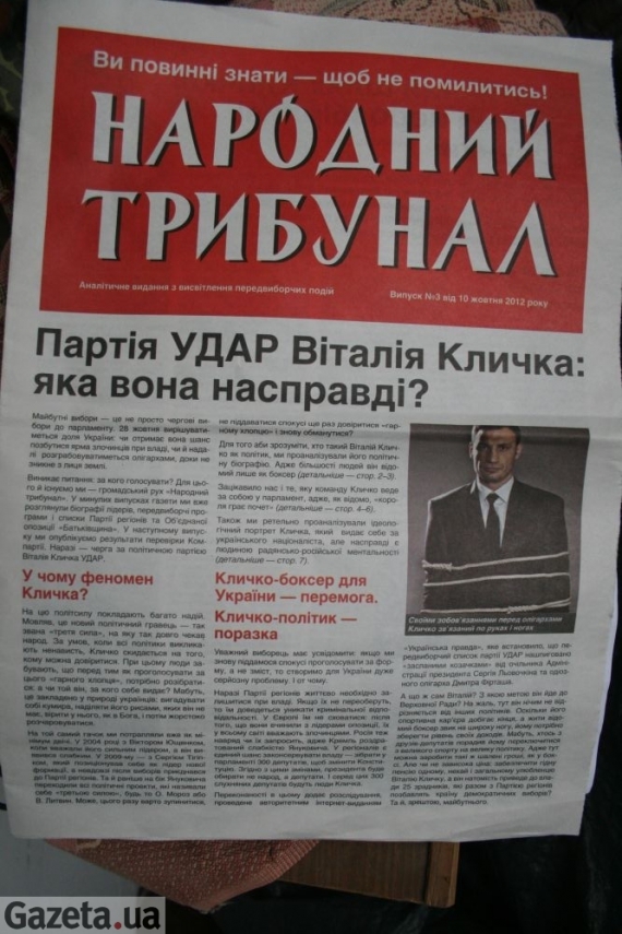 "Газеты без выходных данных разбросали по ящикам всех тернополян с самого утра. Такая газета пошла по всей Украине. Мы ломали голову над ты кто эту "чернуху" распространяет, а оказывается это "Свобода". В пакетах, которые выносили из их офиса, была их официальная агитация, и эта газета - "Народный трибунал", - рассказала Gazeta.ua председатель областного исполкома партии "УДАР" Наталья Михно.