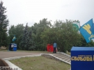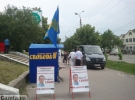На площади перед домом культуры установлена ??сцена. У нее 6 палаток с символикой УДАРа, "Батькивщины" и "Свободы". Люди в безрукавках УДАРа раздают газету "Моя Батькивщина", в которой агитируют за единого кандидата от оппозиции на должность мэра Василькова Сергея Сабова.
