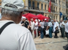 Люди пока размещаются на площади. Здесь в палатке "Батькивщины" бесплатно раздают негазированную воду "Карпатская родниковая". Также дают бейсболки, чтобы у людей не было теплового удара.