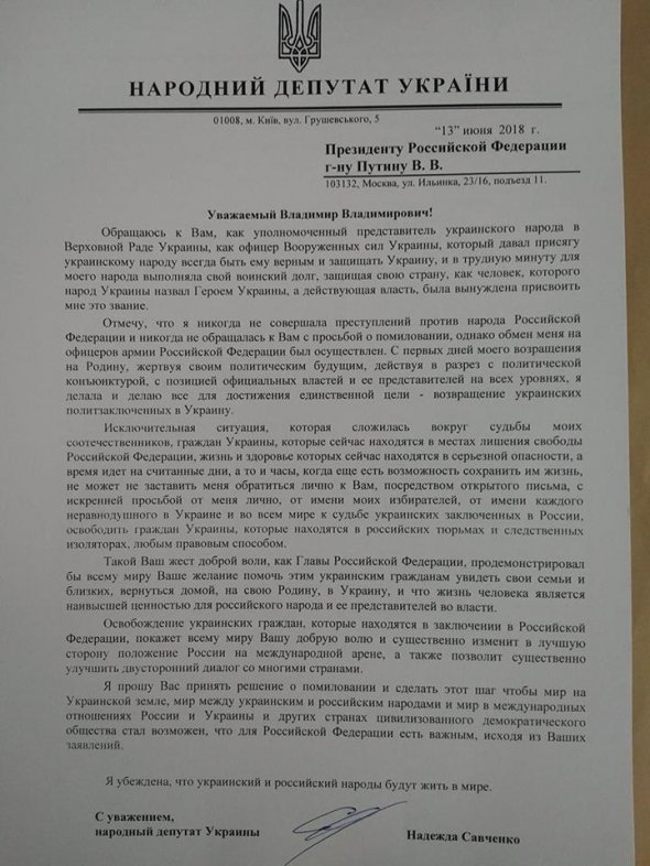 "Я прошу вас принять решение о помиловании и сделать этот шаг, чтобы мир на украинской земле, мир между украинскими и российскими народами и мир в международных отношениях России и Украины и других странах цивилизованного демократического общества стал возможен, что для Российской Федерации является важным, исходя из ваших заявлений", - говорится в письме Савченко, которое она разместила в Facebook.