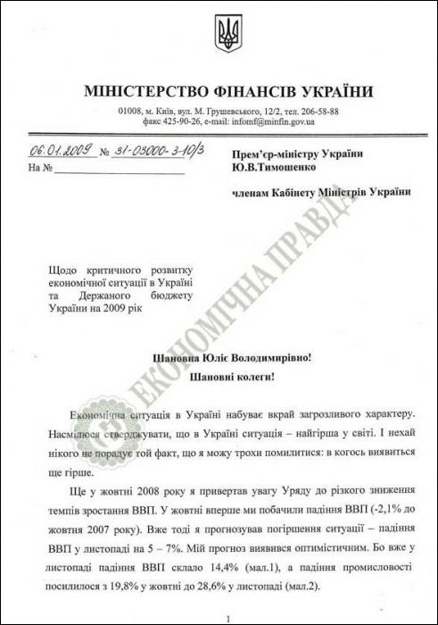 "Факты, изложенные в нем (письме), в случае их достоверности более чем убедительно свидетельствуют, что, во-первых, Украину ожидает небывалая во время независимости экономическая катастрофа, и, во-вторых – нынешнее правительство и, прежде всего, его руководитель старательно скрывают реальное положение дел в экономике от общественности", - подчеркивается в сообщении.