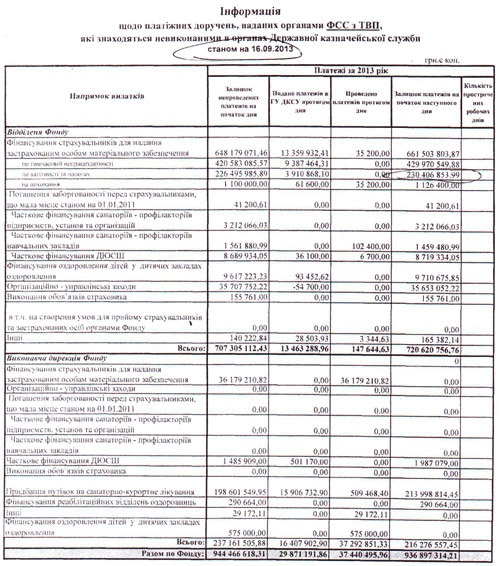 Согласно документу, казначейством состоянию на 16 сентября невыполненными были платежные поручения Фонда по временной нетрудоспособности на сумму почти 937 млн. грн., в том числе невыплата больничных составила 430 млн. грн., декретных - 230 млн. грн.