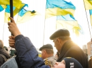 Собравшиеся держали национальные флаги с черными ленточками, свечи, также перевязанные черными ленточками, колоски пшеницы и плакаты с надписями "Голодомор – геноцид 1932-1933 гг. Помним".