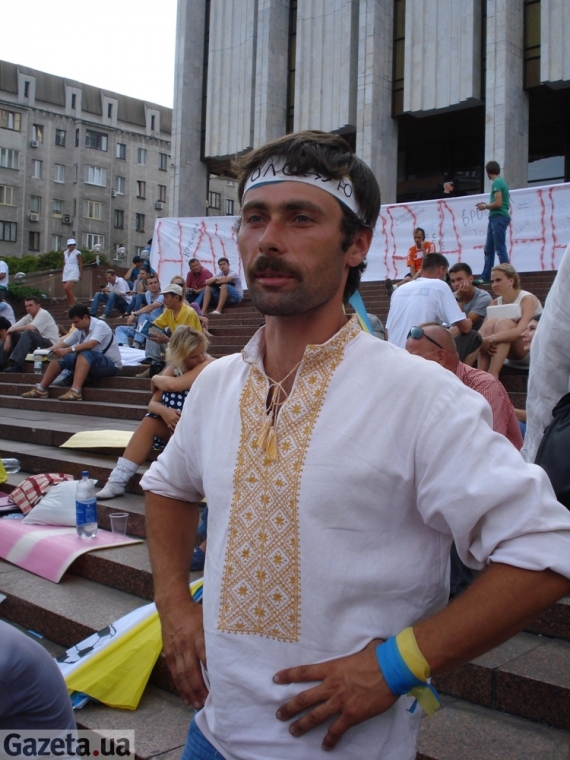 Сам он находится возле Украинского дома еще с первого дня, т. е. с 4 июля. Родом из Кременца (Тернопольская область), приехал автостопом. Говорит, что он фермер, а дома оставил свои овцы и коровы и приехал сюда.