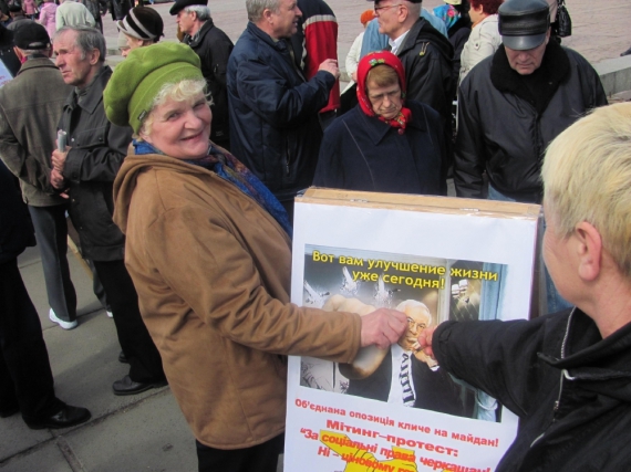 На площади разместили плакаты с фотографиями Ахметова, Фирташа, Януковича. На них написано, у кого из них и насколько улучшилась жизнь. На отдельном плакате - премьер-министр Николай Азаров с дулей. Прохожие тыкали дули ему в ответ.