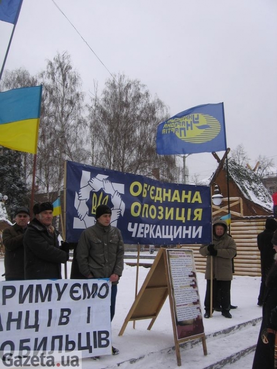 "Сегодня власть сама объединяет Украину, и учителя, и студенты, и чернобыльцы, и афганцы объединенные общим врагом. Этим врагом является антинародная власть, президент, правительство, наш губернатор", - говорит в микрофон координатор объединенной оппозиции Черкащины Леонид Даценко.