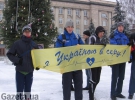 Участники акции выстраиваются в два ряда на Соборной площади. Держатся за руки. Скандируют "Слава Украине! - Героям слава!", "Слава нации! - Смерть - врагам!".