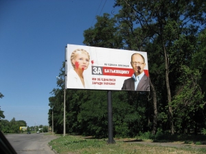 На выходных в Черкассах неизвестные повредили 26 из 32 билбордов Объединенной оппозиции "За Батькивщину", где изображены Юлия Тимошенко и Арсений Яценюк.