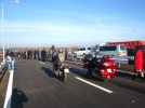 Первыми по новой дороге проехали грузовики строительной компании, украшенные белыми и голубыми воздушными шариками, и байкеры. Президент весело махал им рукой.
