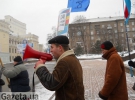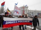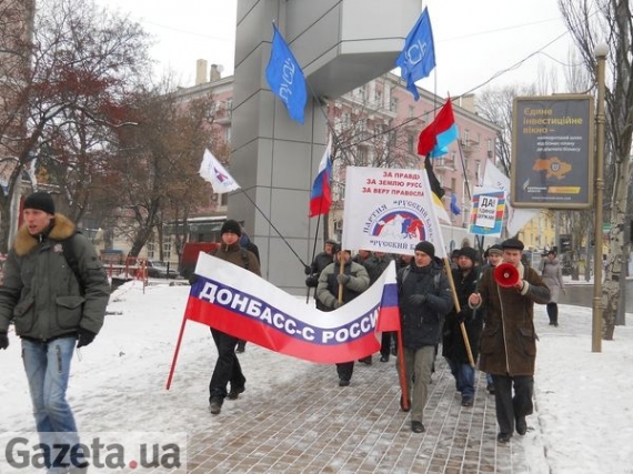 Сегодня в Донецке состоялись три акции. В 11.00 от копии Царь-Пушки, подаренной городу москвичами, стартовал марш членов партии "Русский блок". 28 участников провели митинг за воссоединение с Россией, который приурочили к 358-ой годовщине Переяславской Рады. Во время акции они вспоминали Донецко-Криворожскую республику, утверждали, что Донбасс никогда не был частью Украины, критиковали президента Януковича за то, что русский язык не стал в Украине вторым государственным, кричали "Да здравствует разлука с Украиной!" и "Долой бандеровскую оккупацию!".