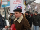 Участникам митинга пытались мешать воинственно настроенные мужчины из организации "Никто кроме нас". Они кричали: "Уберите фашистскую символику!", называли фашистким черно-малиновое знамя ОУН-УПА и несколько раз попытались его отнять.