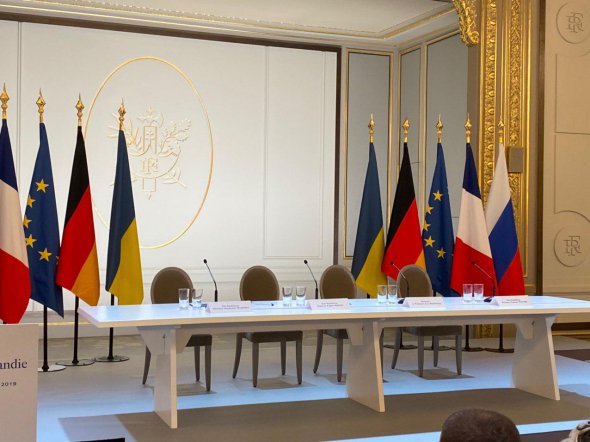 За столом главы государства будут сидеть в таком порядке: президент Украины Владимир Зеленский, канцлер Германии Ангела Меркель, президент Франции Эммануэль Макрон, российский лидер Владимир Путин.